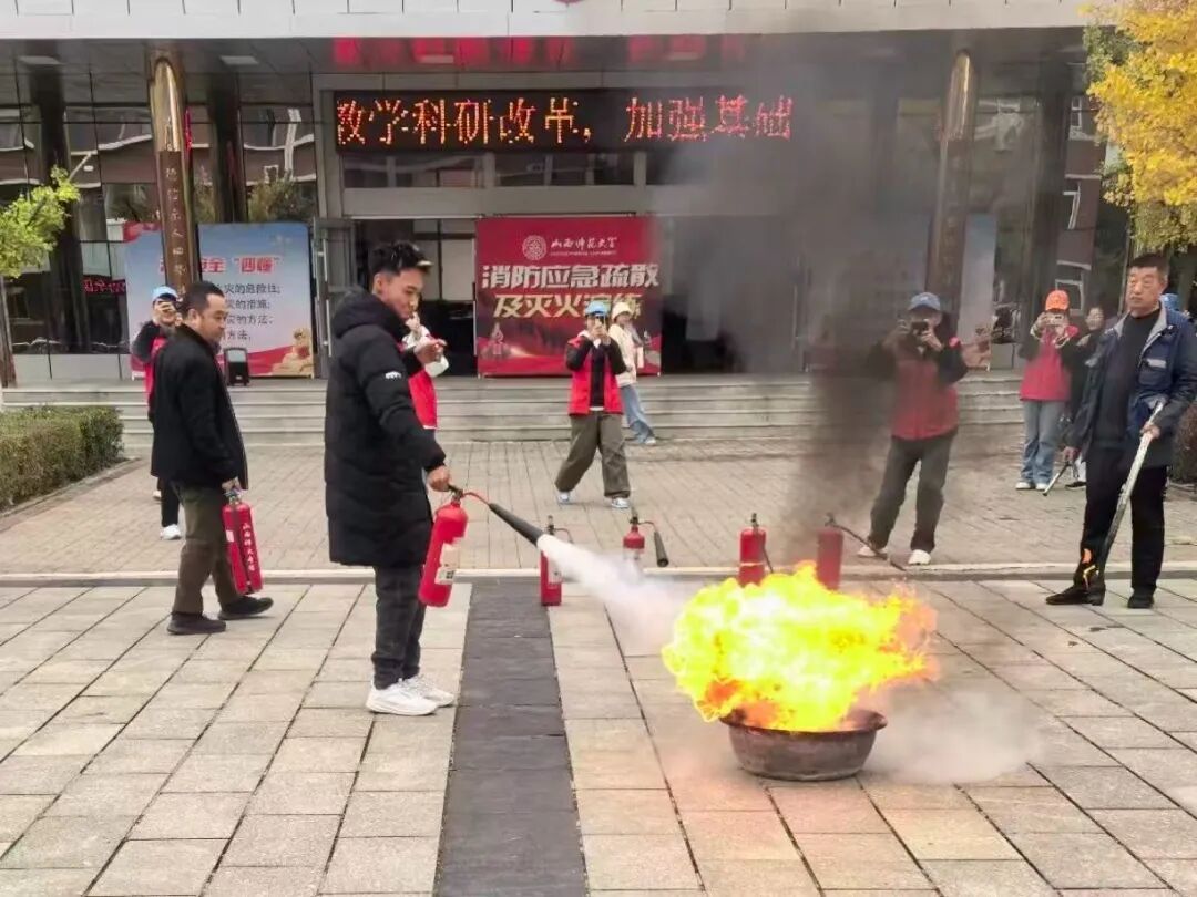随后,邀请保卫部崔哲老师为同学们讲解消防安全知识,帮助大家深入了解相关常识,明晰灭火器种类及消防水带、水枪等器材的使用方法。讲解中,崔哲老师结合室外与室内灭火的实际案例,详细介绍并专业演示了灭火器“提拔握压”的正确操作技巧,还带领学生开展消防器材实操练习。学生们踊跃参与,通过亲身实践,切实掌握了正确高效使用灭火器的方法。